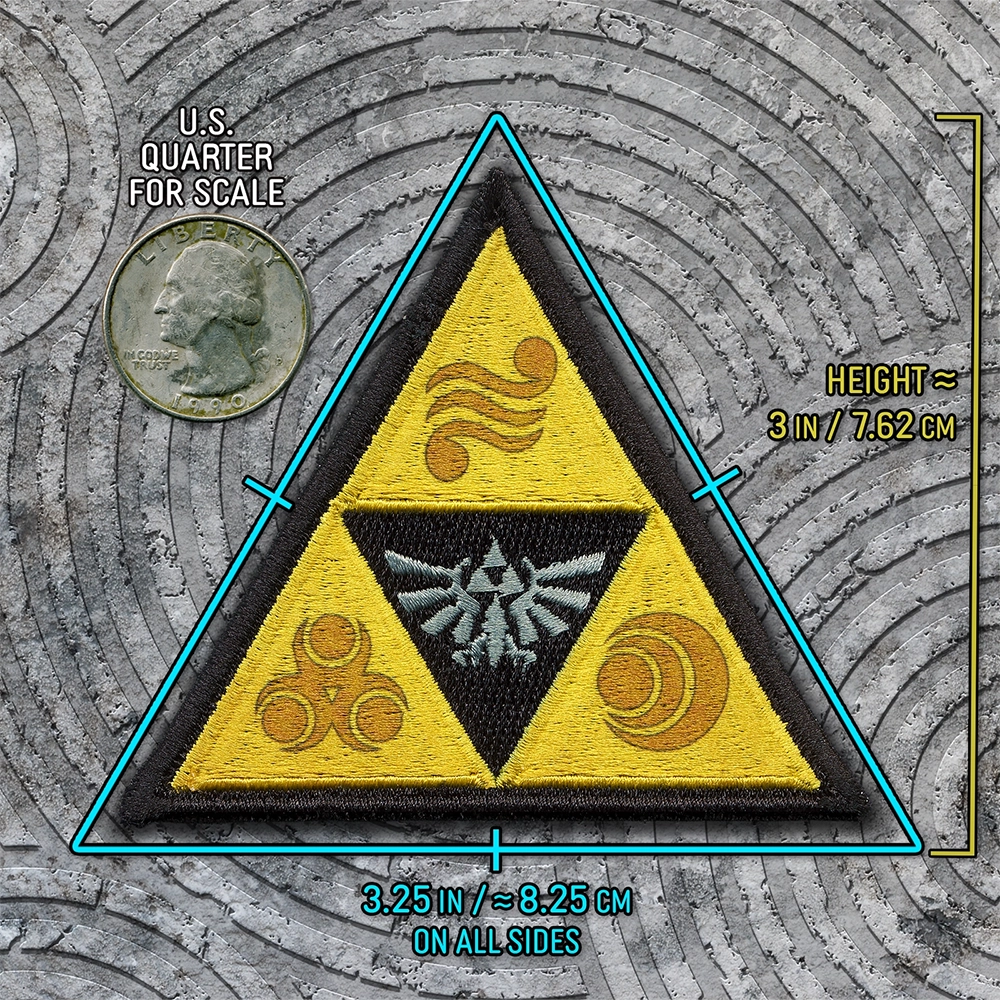 Embroidered patch inspired by the Triforce symbol found in various forms across all Zelda games. The yellow Triforce pieces and the Loftwing Hylian Crest in the center are embroidered, with the Spiritual Stone details imprinted upon the Triforce pieces through dye sublimation.