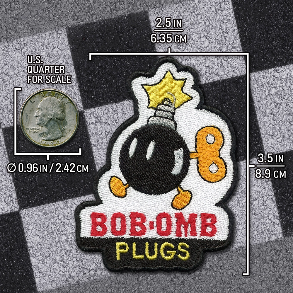 Embroidered patch inspired by the Bob-omb Plugs emblem seen along the raceways of Mario Kart 8.