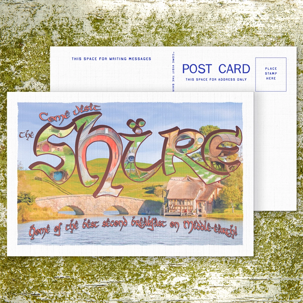 Postcard inspired by JRR Tolkien’s fictional location of The Shire, most well-known as the home of the heroic hobbits Bilbo and Frodo Baggins, Samwise Gamgee, Meriadoc “Merry” Brandybuck, and Pippin Took in The Hobbit and The Lord of the Rings novels and films. Images have been adapted from photographs of the original Hobbiton village constructed in New Zealand for the film adaptations. The text along the bridge reads “Home of the best second breakfast on Middle-earth!”