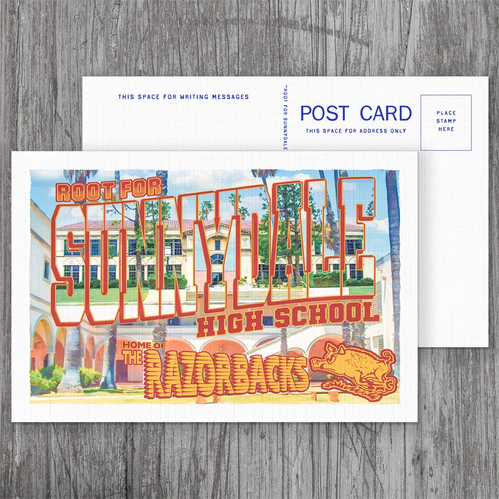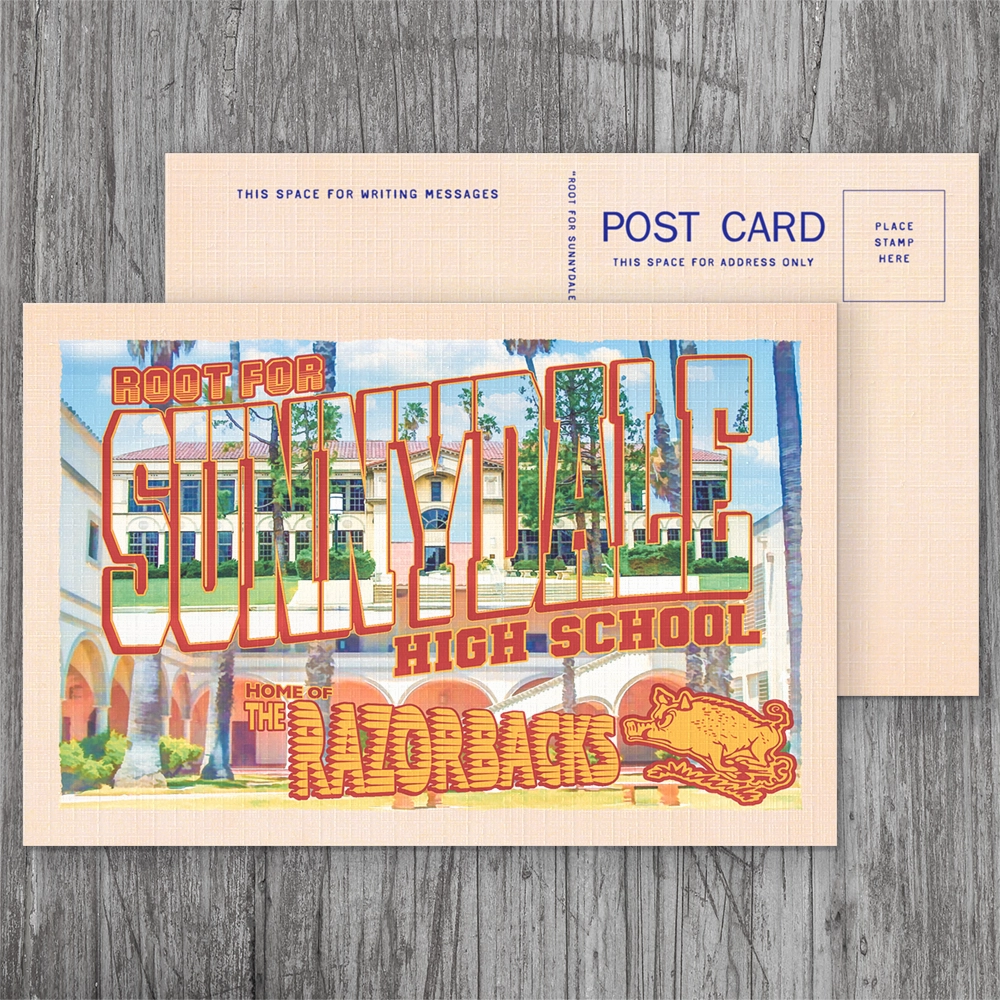 Postcard inspired by the original Sunnydale High School that appeared in seasons 1ā3 of the acclaimed television series Buffy the Vampire Slayer. Postcard images feature front and courtyard views of the real-world Torrance High School, which was the primary filming location for BtVS (as well as Beverly Hills 90210 and the movie She’s All That). Also featured is a Sunnydale High Razorbacks mascot logo and text that is faithful to pennants seen in the background of various Buffy episodes.